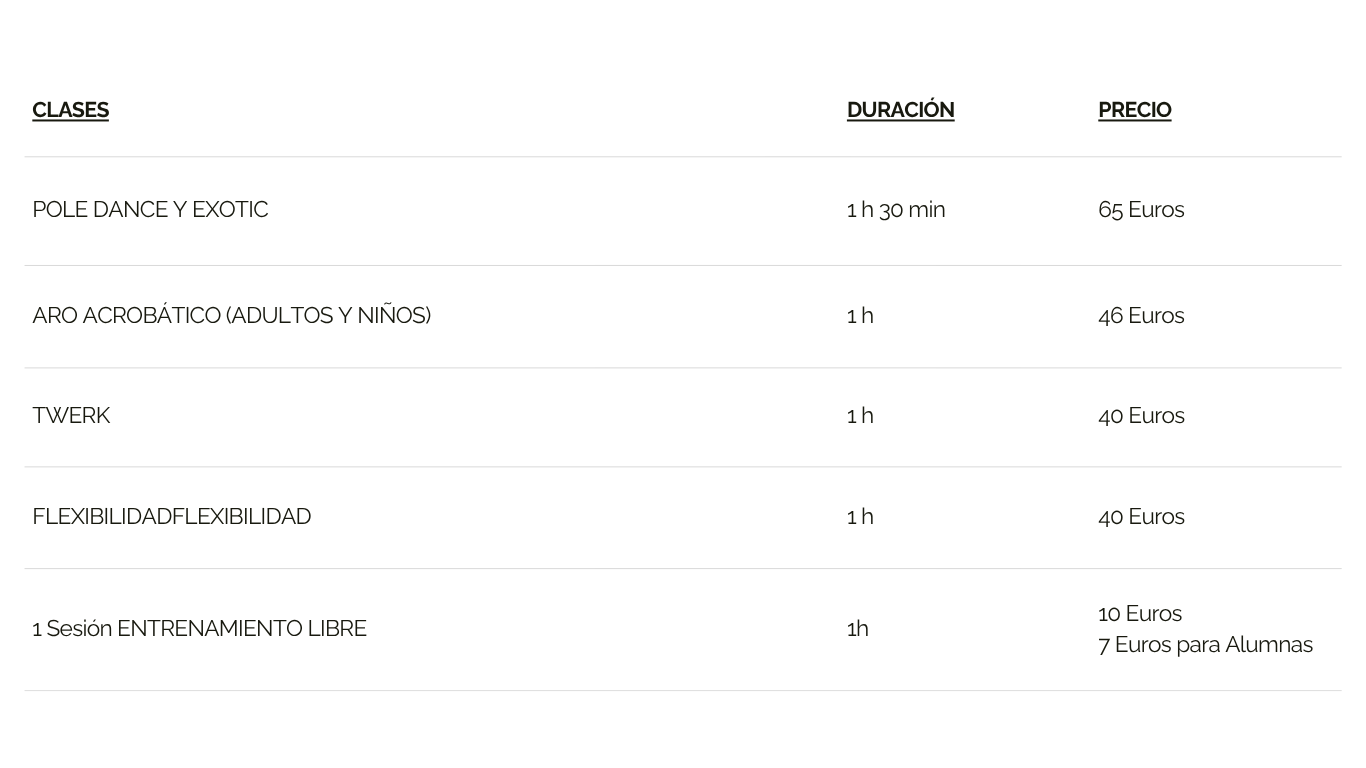 Se admiten cambios entre Pole Dance y Exotic o Flexibilidad y Twerk, el resto de disciplinas no se pueden alternar. Si puedes probar clases nuevas por solo 10 euros.